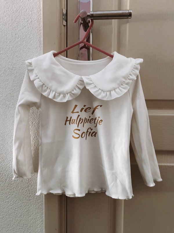 Dankzij de persoonlijke bedrukking met naam voelt elk kind zich een écht hulppietje van Sinterklaas. Ideaal voor pakjesavond, het Sinterklaasfeest op school of gewoon om thuis in de feeststemming te komen. De sierlijke kraag met ruches maakt het shirtje extra lief en bijzonder.