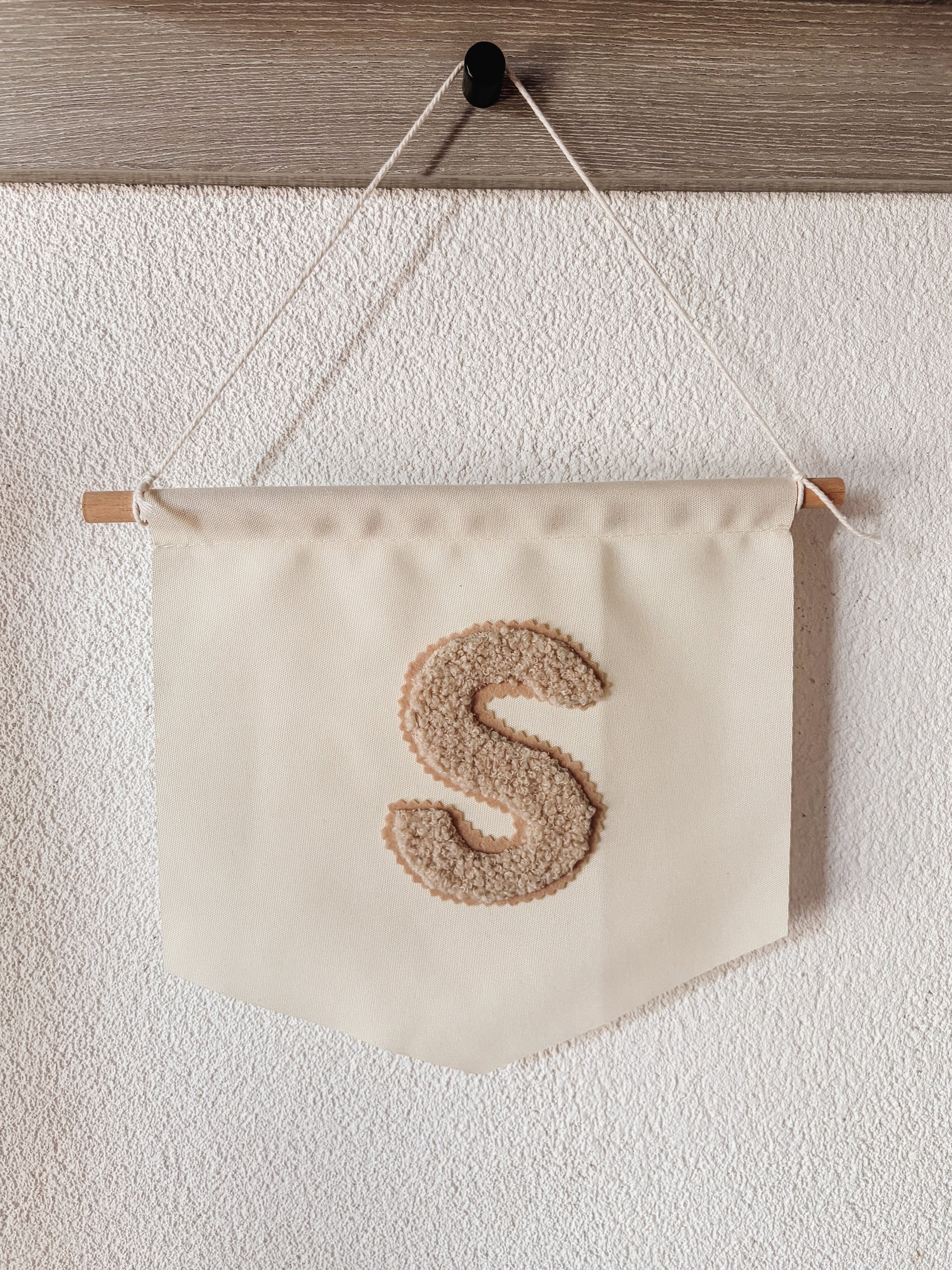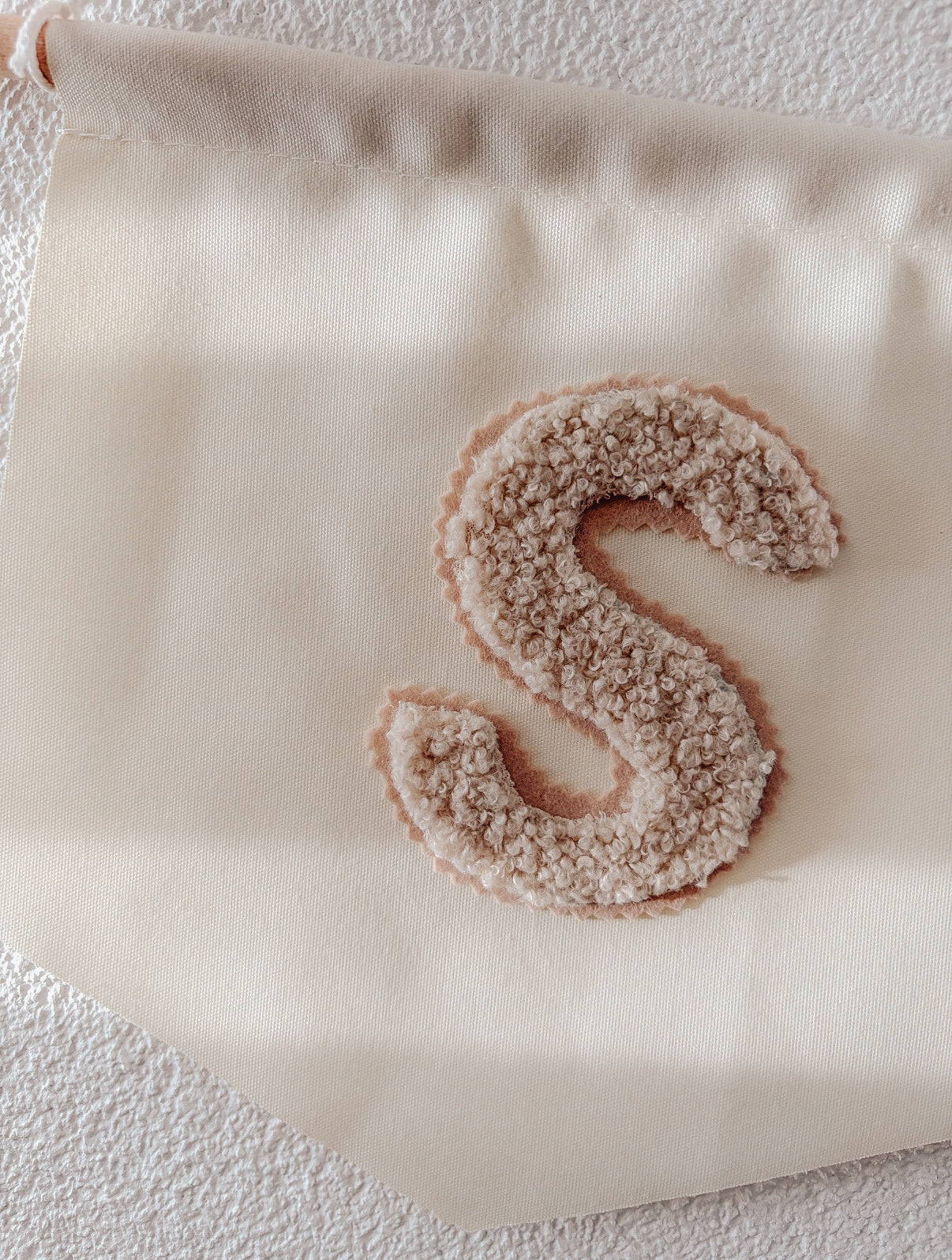 De zachte teddy stof geeft een warme, rustige uitstraling en met de initiaal maak je het net wat persoonlijker. Het initiaal is van teddy stof en wordt op een bijpassende vilt stof gemaakt met een kartelrand om het wat speelser te maken. Mooi boven het bedje, bij de commode of aan de muur als subtiel detail.